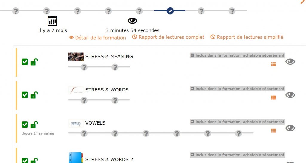 2. Vous pouvez voir le temps passé total et sur chaque module. Les modules que vous avez ouvert apparaissent en bleu avec un tick